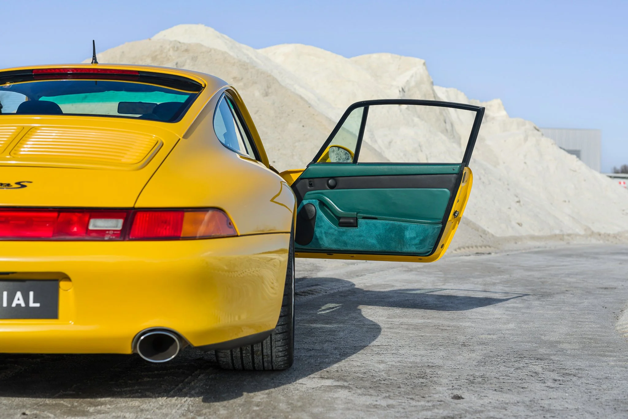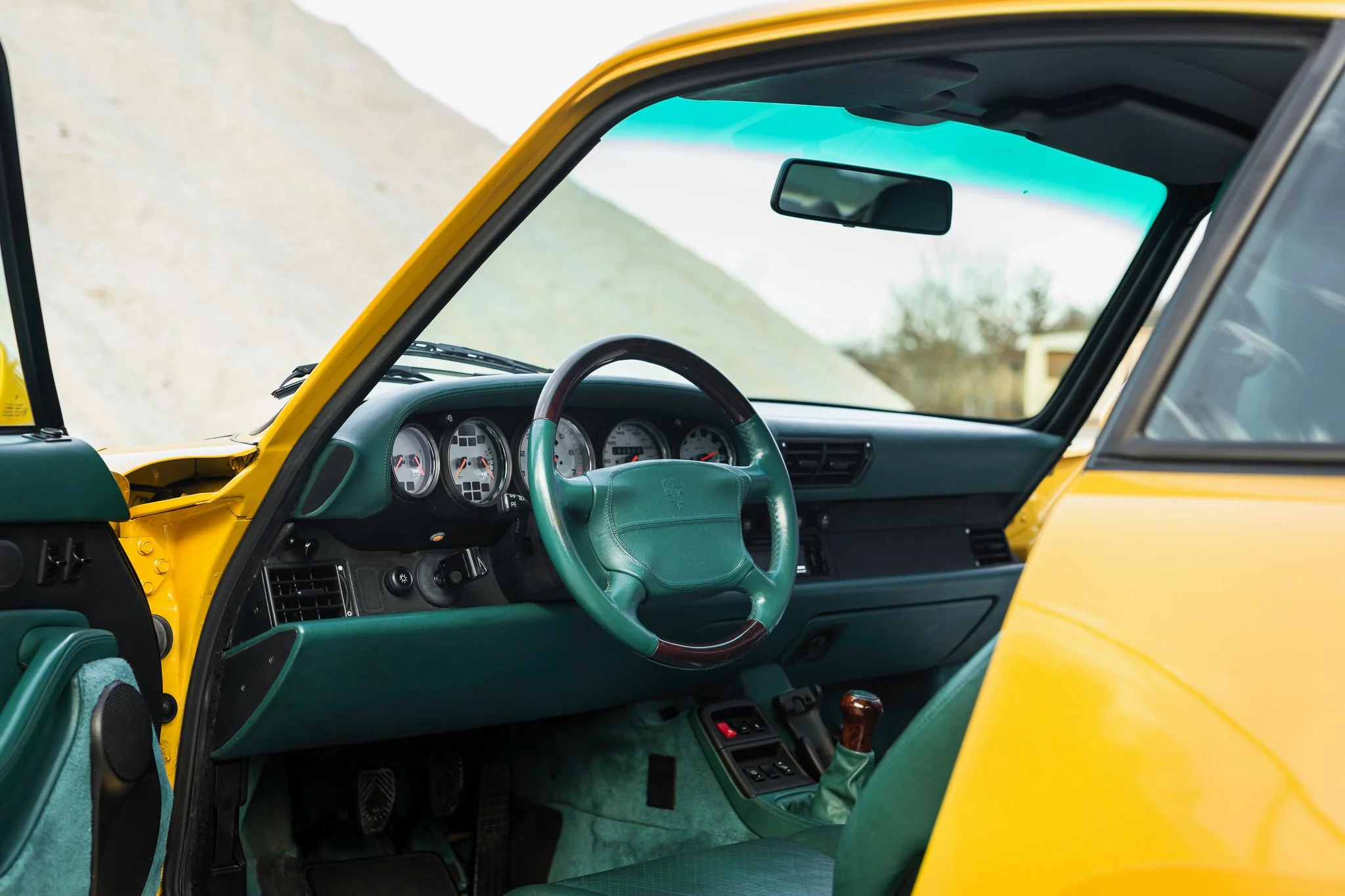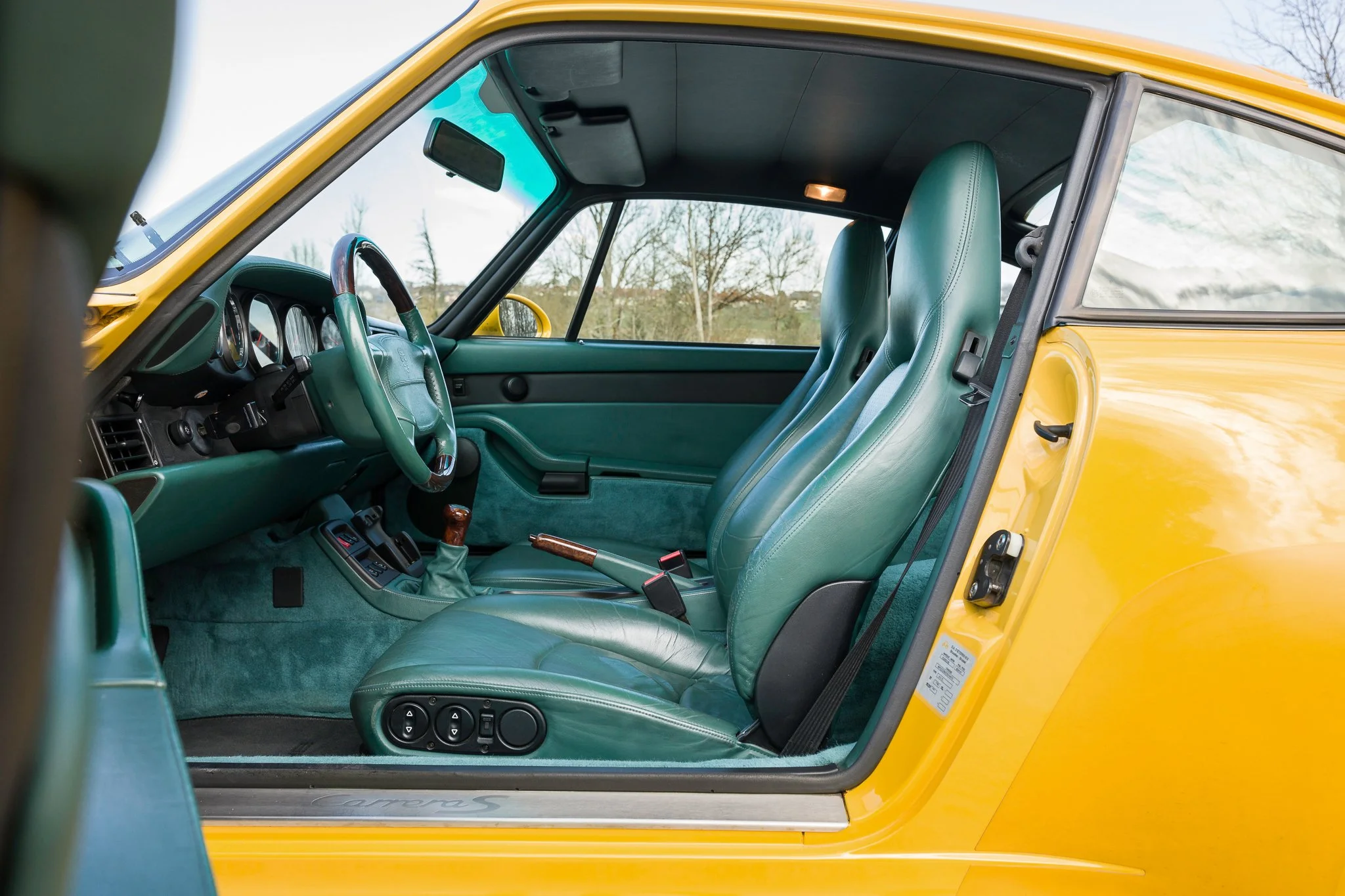 1997 Porsche 993 S 3.6L 285 Coupé with 6 speed mechanical gearbox, a one of one exclusive character in an extraordinary Speed Gelb over Nephrite Green configuration with the benefit of taking advantage of rare options speced by Cologne's Weissweiller.